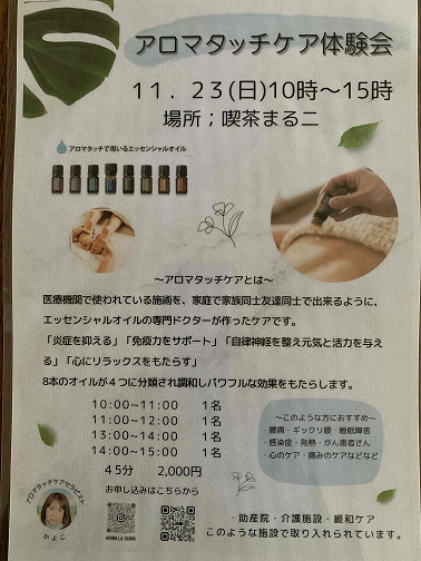 アロマタッチケア体験会 Posted on 2025年11月17日2025年11月17日 by maruniowner 開催日: 2025年11月23日 10:00 - 15:00 アロマタッチケア体験会 11月23日(日) 10:00~15:00 場所:まる二 (スペースまる二)
