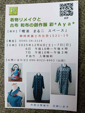 着物リメイクと古布 和服の創作服 彩 *Aya* Posted on 2025年11月17日2025年11月17日 by maruniowner 開催日: 2025年12月6日 10:00 - 2025年12月7日 15:00 着物リメイクと古布 和服の創作服 彩 *Aya* 12月6日(土) 10:00~16:00 12月7日(日) 10:00~15:00 場所:まる二 (スペースまる二)