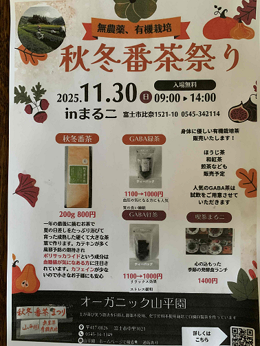 秋冬番茶祭り 山平園 Posted on 2025年11月17日2025年11月17日 by maruniowner 開催日: 2025年11月30日 09:00 - 14:00 秋冬番茶祭り 山平園 12月30日(日) 9:00~14:00 場所:まる二 (スペースまる二)